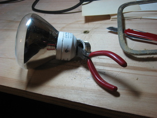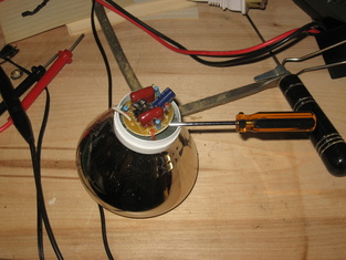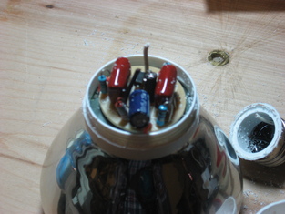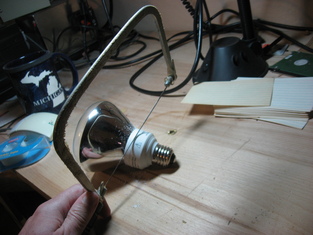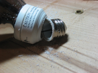 | Sawing around the joint didn't get me as far as I'd have liked, so I ended up sawing off the screw-in part of the bulb. No surprise, this is attached to the bulb innards with a couple wires. |