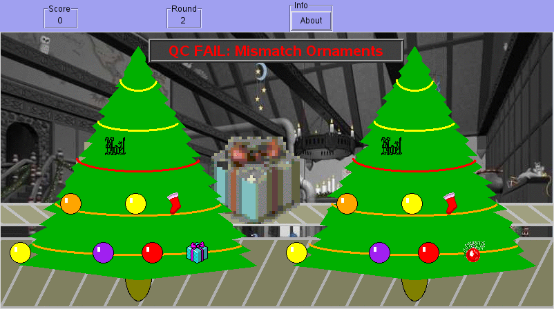 As Christmas approaches, Quality Control at the North Pole goes downhill. Everyone is just trying to get things out the door as fast as they can, regardless of quality. The Big C isn't so thrilled with this lack of quality. It's his brand, after all. So, you've been hired to check the Christmas Trees and confirm that they are identical.